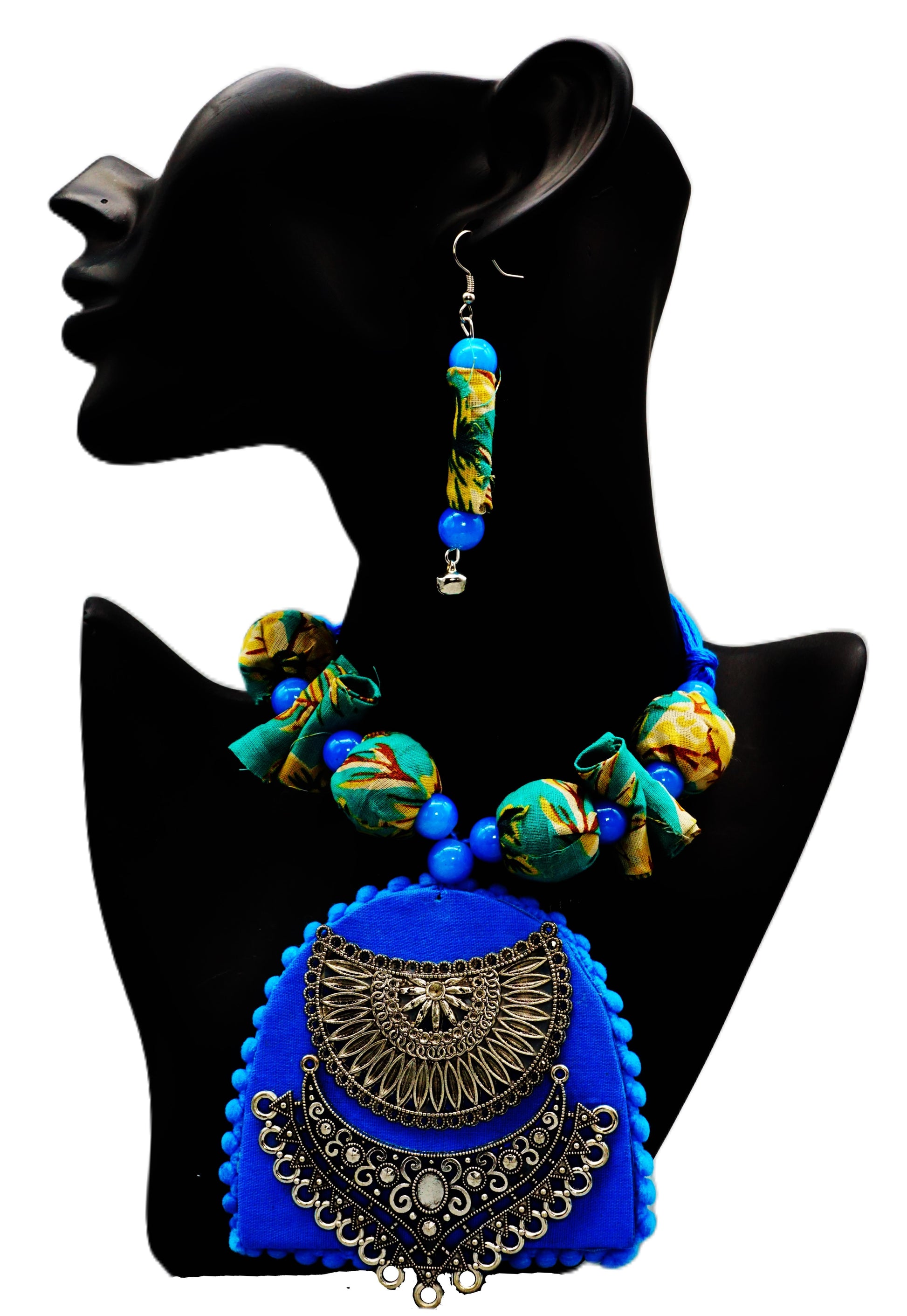 German Silver Blue color Fabric Base Fully Handcrafted Necklace and Ear Ring Set